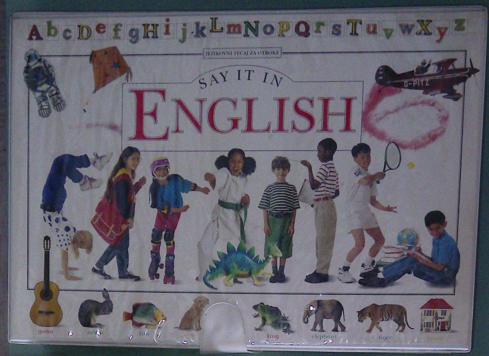 Komplet Say it in English (Mladinska knjiga, 1996) je zasnovan kot celovit večmedijski jezikovni tečaj za otroke, predvsem za učenje doma ob pomoči staršev. Sestavljen je iz več medsebojno povezanih delov: